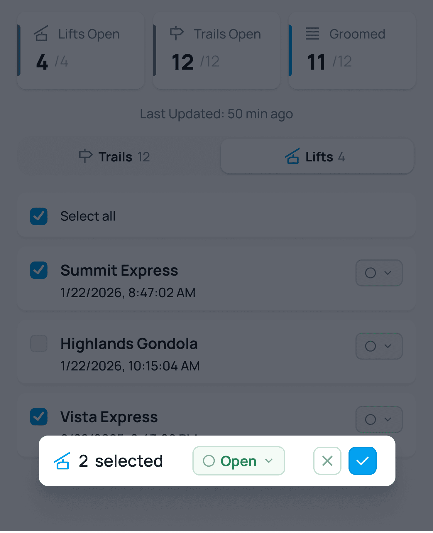 Manage lift, trail, and feature status. Updates automatically sync across maps, route plans, status page, and alerts
